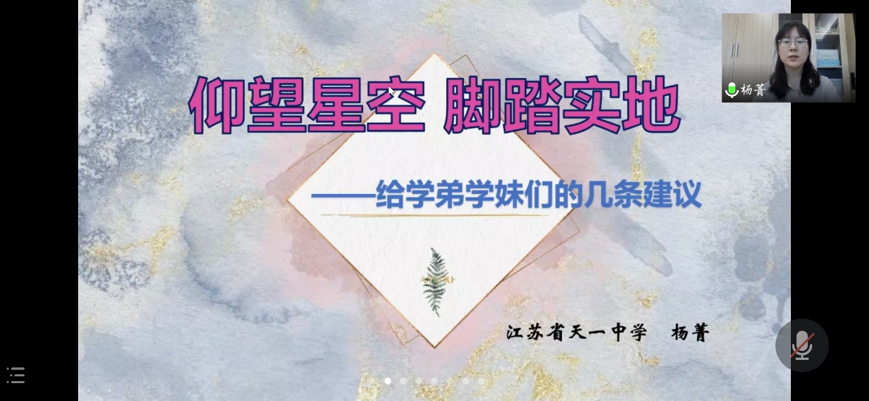 为做好2021年度的教育实习工作,提升思想政治教育专业学生的专业素养与教学水平,借鉴先进经验,深入把握中学教育实践现状,学院邀请江苏省天一中学政治教师杨菁老师于91514时在腾讯会议开展题为“仰望星空,脚踏实地——中学政治教师的成长之路”的线上讲座。此次讲座由思政教研室主任王一成老师主持,2018级、2019级、2020级思政专业全体学生共同参与。