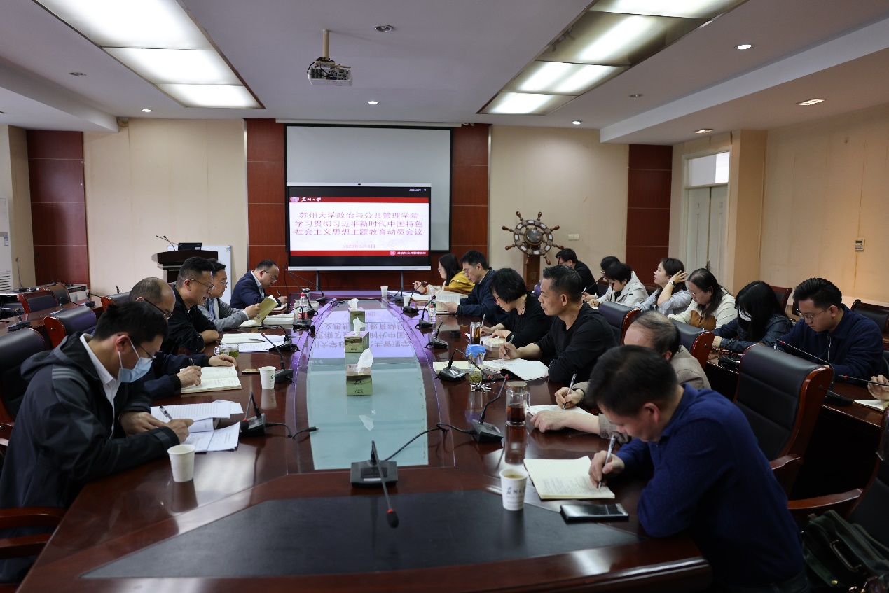 5月8日,政治与公共管理在606-6317会议室召开学习贯彻习近平新时代中国特色社会主义思想主题教育动员会议。学院党委理论学习中心组成员、各党支部书记、各科室主任等参加会议。