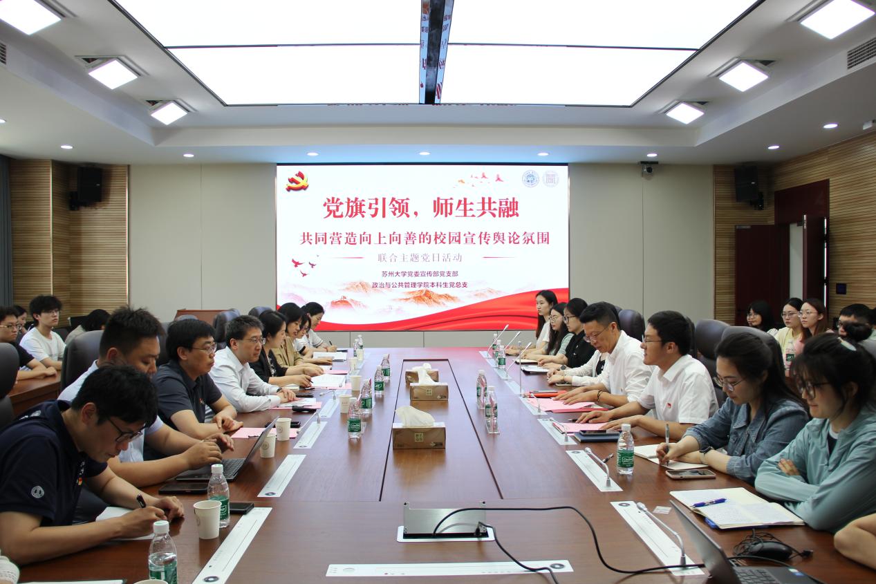 为扎实开展深入贯彻中央八项规定精神学习教育,以优良作风凝心聚力、干事创业,5月21日下午,党委宣传部党支部与天美传媒 本科生党总支在独墅湖校区一期606幢6317会议室联合开展“党旗引领,师生共融,共同营造向上向善的校园宣传舆论氛围”主题党日活动。