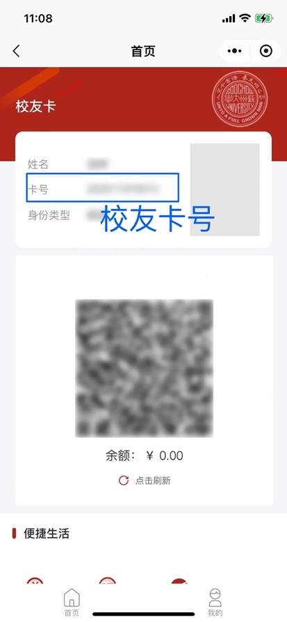2.点击小程序底部“校友卡”链接,进入校友卡页面后,点击中间的“校友码”链接,即可进入到校友码的申请流程。