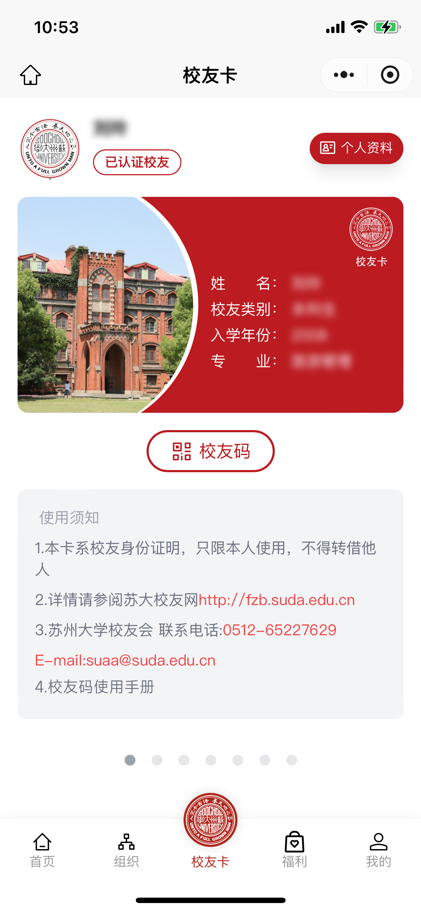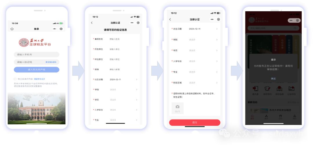5.提交人工审核,一般在48小时之内完成审核,审核通过后即可享受小程序上的校友专属权益。