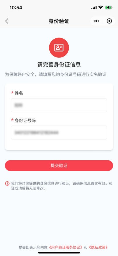 3.进入身份核验页面,检查姓名和身份证号是否正常,确认后提交验证。