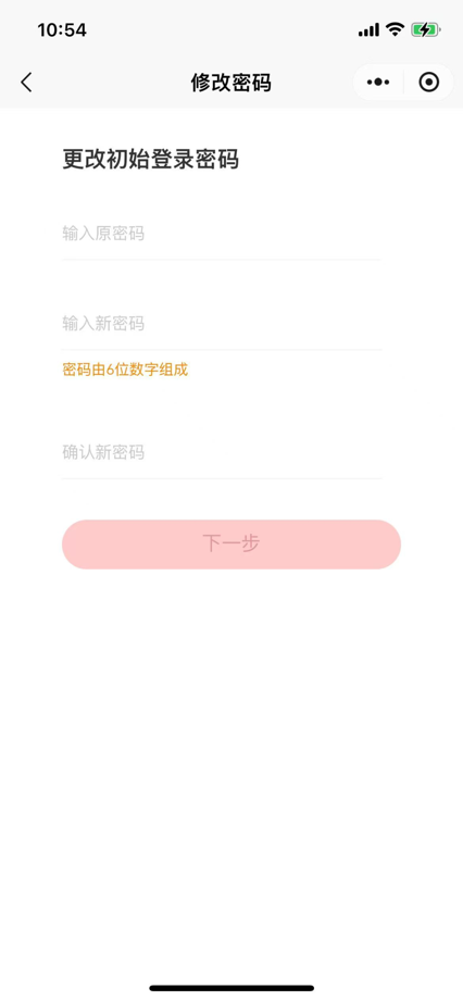 5.首次进入校友码页面会出现修改密码的操作,请输入初始密码(身份证号后六位,末尾为X的用数字0代替)和新密码,然后进入下一步。
