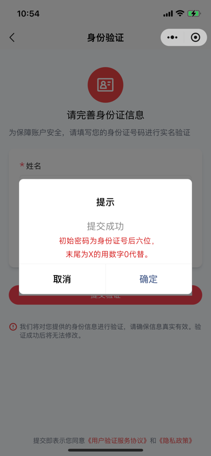 4.完成身份验证后,出现成功弹窗,务必牢记初始密码,初始密码为:身份证号后六位,末尾为X的用数字0代替。