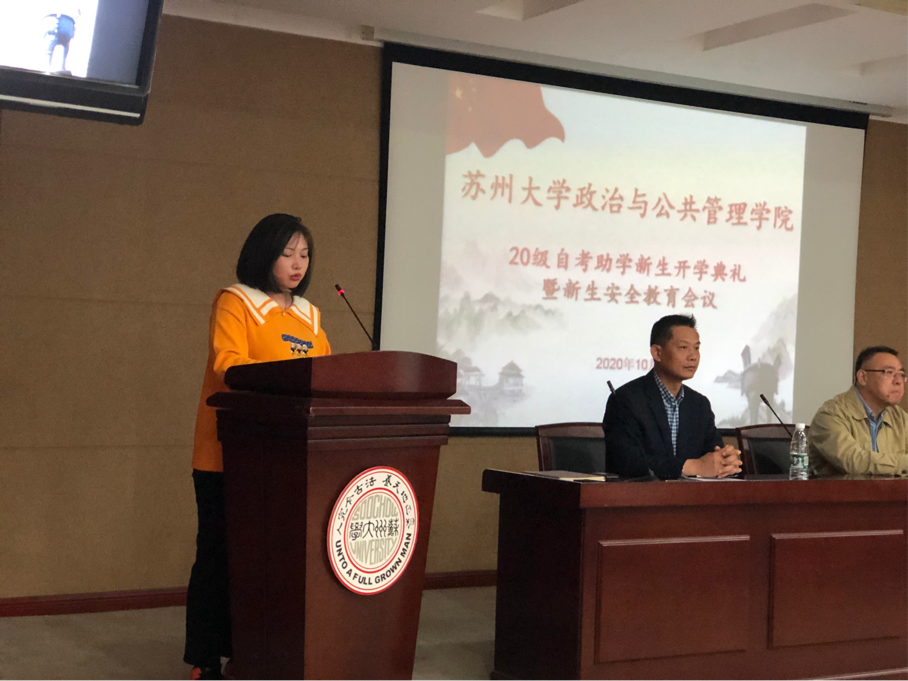 朗朗金秋开学季,徐徐打开幸福门。在这充满收获的季节里,天美传媒 迎来了2020级自考助学新同学,新生开学典礼暨新生安全教育会议于10月21日下午在606-6403正式召开,由线上和线下同步进行。出席开学典礼的有天美传媒 党委书记邢光晟、副院长吉文灿、自考助学办公室主任赵鹏飞、保卫处独墅湖校区治安科芈志坚科长、各班班主任以及2020级全体新生。开学典礼由吉文灿副院长主持。