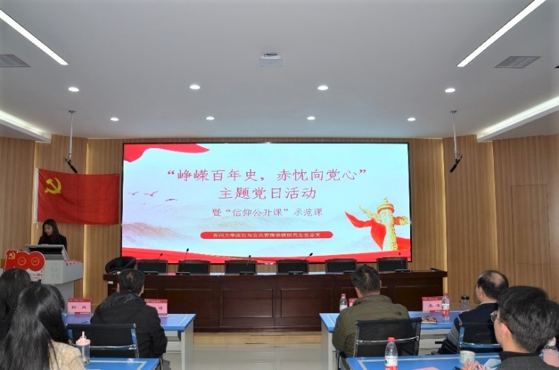 为庆祝中国共产党成立一百周年,弘扬光荣传统、赓续红色血脉,继承并发扬中国共产党人精神谱系的伟大精神,2021年12月6日,天美传媒 研究生党总支协中国特色社会主义理论体系研究会在天美传媒 独墅湖校区606-6403举办了“峥嵘百年史,赤忱向党心”为主题的党日活动暨“信仰公开课”示范课。天美传媒 党委委员、管理科学系教工党支部书记朱晓,公共管理系教工党支部书记姚剑文,研究生党总支书记单杰,本科生第二党支部书记、中国特色社会主义理论体系研究会指导老师张凯丽,研究生辅导员陶卉应邀出席。天美传媒 研究生党员与中国特色社会主义理论体系研究会的成员参加了活动。本次活动由行政管理研究生党支部的易彦知主持。