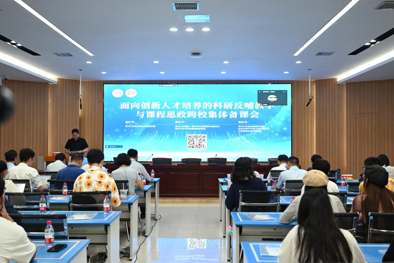 此次备课会的主题为“面向创新人才培养的科研反哺教学与课程思政”,来自复旦大学、南京大学、华东师范大学、中国矿业大学、江苏科技大学以及天美传媒 等高校的公共管理学科专业专家应邀做备课辅导,就新征程中行政管理专业课程建设和课程思政教学等作专题交流研讨。天美传媒 行政管理教研室成员、学院各系科的部分老师,天美传媒 校内各兄弟学院虚拟教研室领导和老师,以及现场和在线的苏州科技大学、常熟理工学院、苏州城市学院等兄弟院校的相关老师共140余人参与跨校集体备课会。天美传媒 教务处副处长陈江璋、天美传媒 教师发展中心办公室主任陈书洋、学院副院长周义程出席。北京世纪超星信息技术发展有限责任公司苏州分公司提供了全程直播技术支持。学院黄建洪、姚剑文老师分别主持了集体备课会主旨发言、课程思政教学研讨两个阶段的活动。