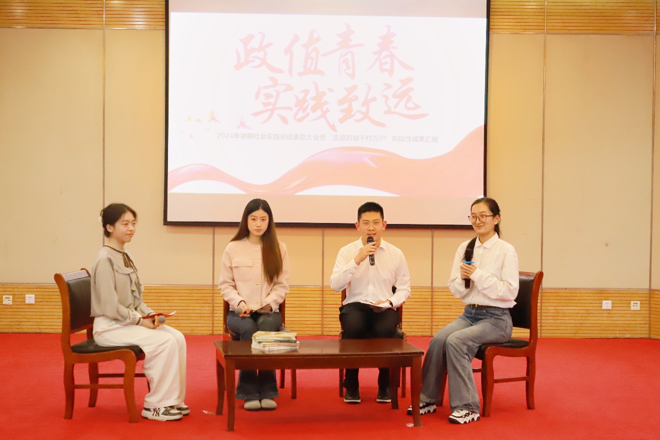 在座谈环节,暑期社会实践先进个人代表丁瑜玮、“哲学+”实践团负责人成一涵、文旅“工”略团队负责人丁艺桐、青茶支教团负责人朱许琴围坐而谈,以互问互答、交流互动的方式,以“担当”“笃行”“专业”为关键词,就实践过程中的经验、挑战和收获进行了深入探讨。“哲学+”实践团用专业的知识为孩子们带来哲学启蒙教育,努力打破唯分数论的教育窘境,推动哲学的跨学科交融;青茶支教团坚定笃行,投身支教事业,播种绿色希望;文旅“工”略实践团有为“担当”,打破工业与文化隔阂,对工业遗产的文旅化转型做出了深刻的分析,让二者共同焕发新生。