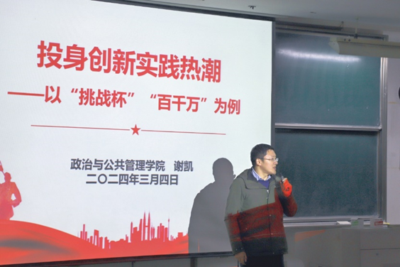 谢凯老师为同学们带来了题为《投身创新实践热潮——以“挑战杯”“百千万”为例》的专题分享。谢老师从大学生培养创新精神和创业能力的必要性、重要性、可行性出发,鼓励同学们积极参加创新创业,将个人理想同国家社会发展需要紧密结合。从凝聚共识到促进行动,谢凯以“挑战杯”为例,进一步从调研选题、调研方法、调研报告等方面进行了细致介绍。他鼓励同学们充分利用院内资源、激发主动创新意识、深入挖掘自身创造力,积极参与学院组织的“走进百城千村万户”工程,围绕社会现实问题进行调查研究,投身创新实践热潮,做科创报国的奋斗者。