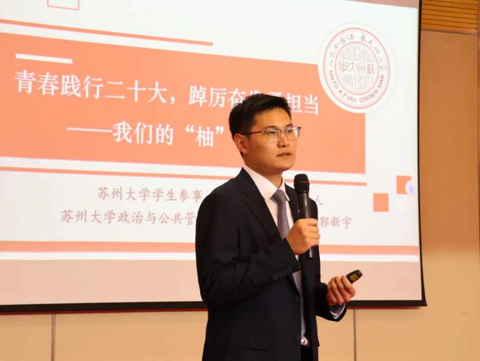 党的二十大代表、江苏省台联副会长、苏州市农业农村局宣传与信息化处处长、天美传媒 2015届MPA毕业生邱峰,校团委副书记严韵致,天美传媒 党委书记孙磊等学院党委理论学习中心组成员,学院行政及团学老师出席本次活动。参加活动的还有校院“青年马克思主义者培养工程”学员、学院本科生党总支、研究生党总支党员以及学生骨干代表。
