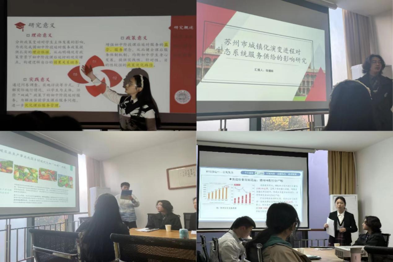 在答辩环节,廖慧同学、张骥闽同学、崔庭毓同学和丁瑜玮同学作为项目代表依次进行汇报展示。廖慧同学着眼于当下“双减”实施过程中初中阶段延时服务暴露出来的问题展开研究,以江苏省内的初中生为主体,结合多种研究方法发掘解决路径。张骥闽同学将课题切入点放在了“城镇化服务”与生态环境的关系上,以“自下而上城镇化”为视角在苏州市展开调查,阐述了课题中采用的多种研究方法。崔庭毓同学将研究视角放在消费者身上,以满足消费者对得到新鲜农产品的愿望为研究方向,用数据与模型向评委展示了其方案的可行性。丁瑜玮同学基于当下快递包装造成大量浪费的现状,在苏州五所高校进行了调查和研究,并提出了快递包装回收的想法。
