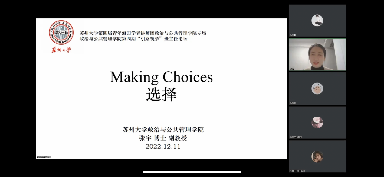 张宇老师以“选择”为主题带来精彩分享,用轻松幽默的话语、生动真实的数据引人入胜。以问题为导向,她启发同学们主动思考选择对于人的重要性。张宇老师结合自身的学习成长经历,以时间脉络,给同学们提出三点建议。一是要学会勇敢忠于自己的内心,例如在选择考研专业的时候,应该减少外界的干扰,根据自己的喜好做出选择。每次做选择的时候都要在心里问自己,尊重自己的内心。二是要学会勇敢去实践和及时止损,张宇老师介绍了她在大学期间参与的社会实践活动,如报名2008年北京奥运会志愿者、参加林肯基金项目等,建议大家在不知道如何选择或者选择过多的时候要学会尝试、实践,拓宽自己的眼界。三是要学会勇敢拥抱不确定性,在社会情况不稳定的当下,应当学会快速接受和适应各种不确定因素。张宇老师分享“选择的困难也来源于不确定的心态,不是所有的选择都能用模型进行计算,都有最优解,心态在选择中也是重要影响因素。选择不仅是一门科学更是一门艺术。”