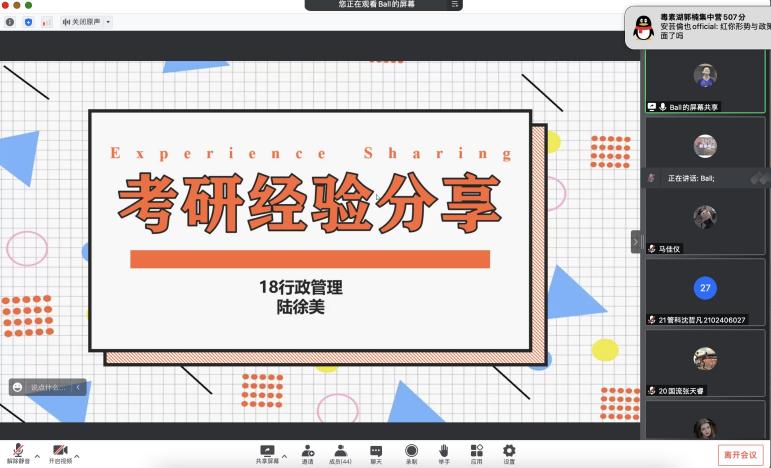 面向全体本科生在腾讯会议开展考研基础学科(英语、政治)高分经验分享会。2018级行政管理专业张鑫、2018级城市管理专业周中天和2018级行政管理专业陆徐美参与了本次分享会。