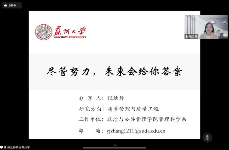 3月30日晚,张延静老师开展题为《尽管努力,未来会给你答案》的主题发言。作为刚刚毕业的青年教师,张老师对于学生的心理与学习状态有着深刻的共鸣。她先强调了对于苏大学生而言,起点绝不是终点,无论同学们对于当下的一切是否满意,唯有努力才能改变现状。为此,张老师从生活,学习,理想三个角度启发同学们进行自我调适。在生活中,张老师建议同学们妥善处理好友情与爱情的关系,课余可以游历河山,多做尝试,要以正确的态度对待游戏。在学习方面,老师认为找对方法比一味努力要更有效率,建议同学们学会自我优化。在最后对于理想的观点中,老师认为理想还是必要的,这是支撑同学们奋斗的内生动力。
