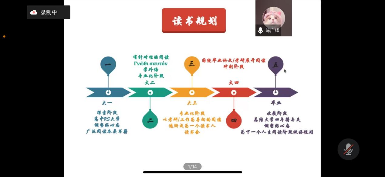 4月5日晚,陈广辉老师开展题为《如何成为一个读书人》的主题发言。陈老师指出,在当下,大学生群体整体缺乏大量阅读,不理解读书对于个人的意义。陈老师认为,读书可以帮助人获得超越生理愉悦的精神愉悦,可以为学生的发展提供思路,有助于学生养成终身学习的习惯。陈老师结合自身阅读经历,认为学生在本科阶段要做到翻万卷书,会百家才。为此他还向我们提供了一份翔实的读书规划,令与会师生都深受启发。