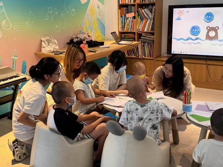 8月14日下午,上海市闵行区闵房泊寓小布家园的活动室内暖意融融,天美传媒 课题团队成员为7名异地来沪就医的困境儿童带来了一堂主题为 “音符流淌的缤纷花园” 的特别课程。