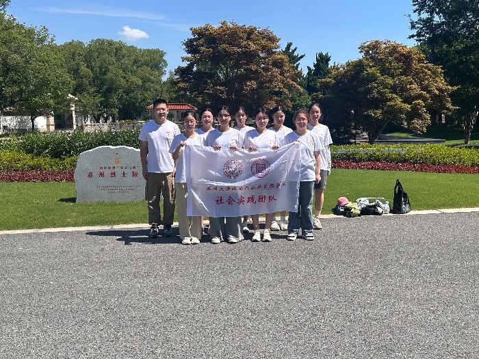 烈士陵园划分为纪念瞻仰与烈士安息两大功能区。纪念瞻仰区雄踞陵园中枢,以主轴线对称布局勾勒出庄严肃穆的空间叙事。这条长约160米的轴线,自西向东循地貌拾级而上,如同一部立体的史书铺展。实践团成员先于牌坊下合影存念,而后沿轴线次第探访纪念场馆,最终在纪念碑前驻足追思。革命烈士纪念碑以四棱雄姿矗立,正面镌刻着陈毅元帅题写的“为人民事业而牺牲是最光荣的”十三金句。碑体高27米,基座的4层台阶暗藏深意,隐喻着1949年4月27日苏州解放这一历史性时刻。烈士骨灰安葬区静卧于纪念瞻仰区北侧,由烈士墓群与烈士骨灰堂共同构成生命的永恒坐标。烈士墓群采用三坛五区的格局,258位烈士的遗骸在此长眠;烈士骨灰堂内,62位烈士的骨灰静静安放,每一份忠魂都承载着一段不朽的传奇。实践团成员手捧预先备好的鲜花,怀着敬畏之心步入这片静土。墓前的二维码如同时空接口,成员们扫码溯源,体悟烈士们波澜壮阔的生平,亦抒发内心真情实感。随后,大家向烈士鞠躬致敬、献花致意,用最朴素的方式完成一场跨越生死的精神传承。