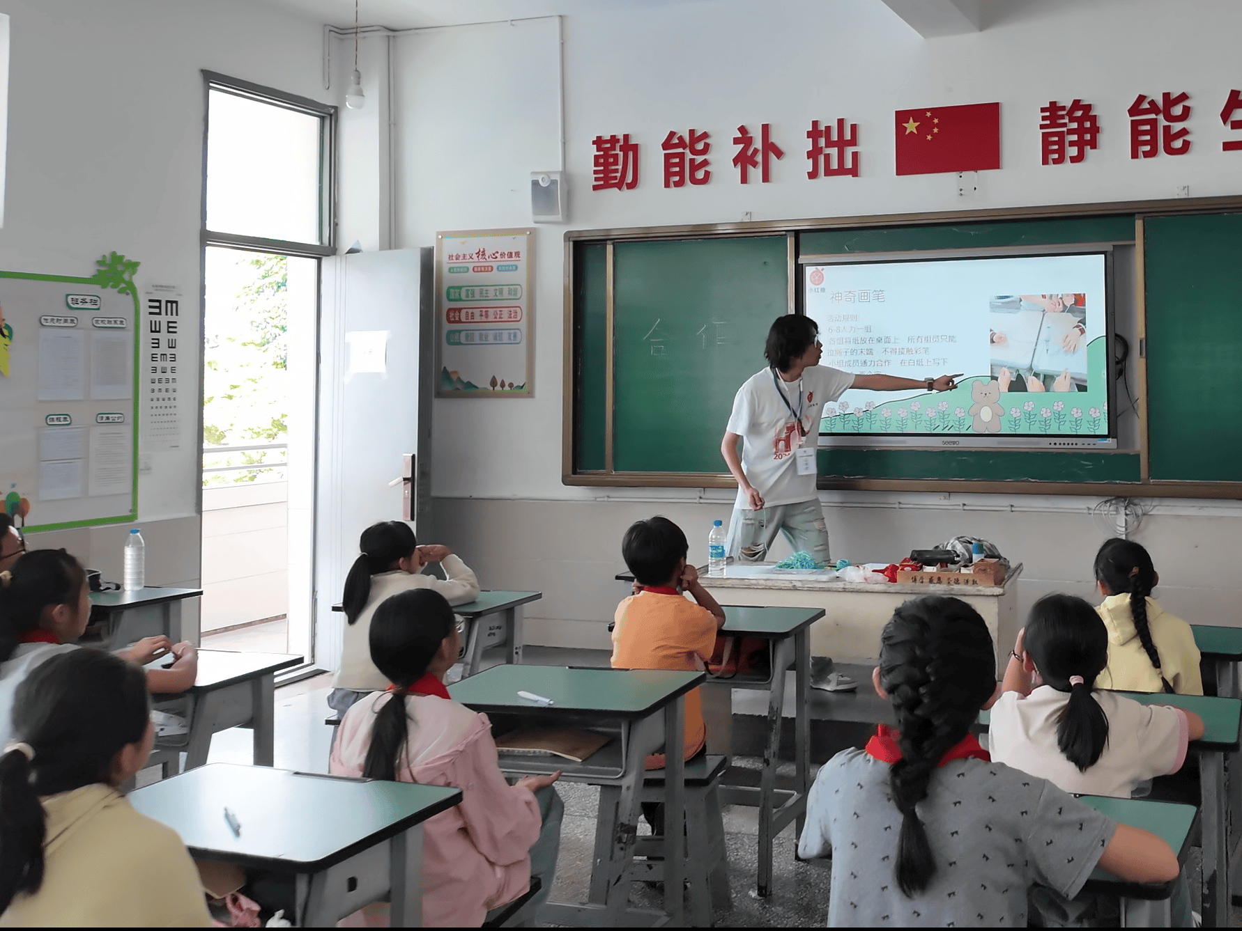 在人生的课题中,除了看见自己本身,与他人相处同样是不可或缺的一环。个体从来不是孤岛,而是群体中的一部分。在合作“聚”给力课堂上,林山豪老师以极具互动性的方式,引领孩子们探索“合作”的真谛。一开始,他鼓励大家发散思维,从生活细节中寻找需要合作的场景,让“合作”先在孩子们心中生根。随后的趣味短片中,憨态可掬的小企鹅们用行动诠释了携手共进的强大力量。紧接着,课堂气氛在“你划我猜”游戏中被推向高潮——一幅幅生动的图画、一声声默契的提示,让成语的答案在欢笑中被迅速揭晓。