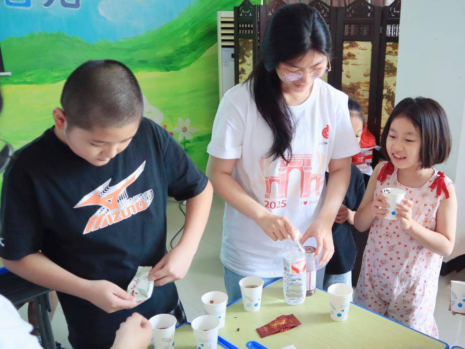 品味千年古韵,唤醒文化记忆。团队成员刘庆妍为孩子们开启了一段浸润心灵的“茶香之旅”。课堂上,她带领孩子们一起追溯茶的起源,探秘中国的六大茶类世界,了解从嫩叶到香茗的蜕变之旅。当不同品类的茶叶在杯中舒展身姿,孩子们好奇地观察、细细嗅闻,再小口啜饮,感受或清新、或醇厚、或甘甜的滋味在舌尖绽放,那一刻,他们明亮的眼睛闪烁着对古老智慧的新奇,小小的茶杯里,盛放的是跨越时空的文化馨香。这缕茶香,如同夏日里的一泓清泉,不仅滋润了舌尖,更悄然浸润着孩子们对中华优秀传统文化的认知与向往,为他们的成长增添了一抹悠远而温润的底色。