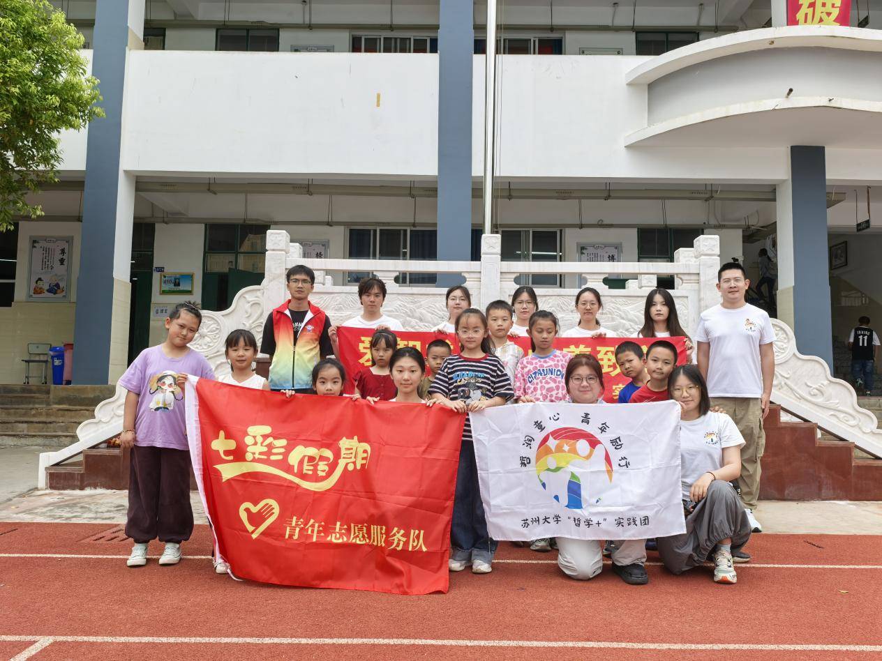 图为义教最后一日,实践团与雲川青年志愿者协会、服务地的小朋友们合影,一起喊出“哲润童心,青年励行”的口号。成一涵 供图