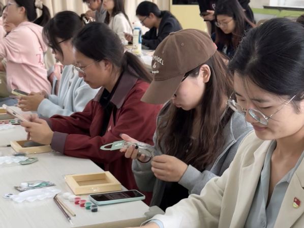 随后,手工制作环节正式开始。在社区美术老师的耐心指导下,大学生党员积极参与,围绕“莲花”“清风”“廉字”等廉洁元素,创作出一幅幅生动的手工作用力作。每一件作品都蕴含着对廉洁文化的理解与认同,廉洁的种子在指尖传递、在心中生根。