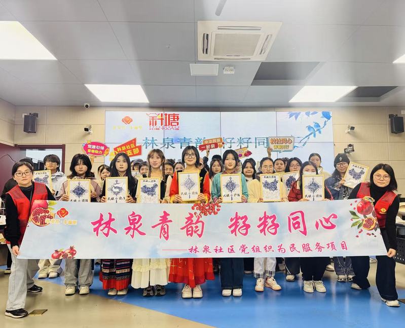 非遗青花瓷陶瓷片拼贴环节,成为整场活动践行“铸牢中华民族共同体意识”的核心载体。为让体验更有意义,工作人员精心准备了“手作礼包”,内含齐全的拼贴工具与印有“石榴籽相拥”“中国结”等主题图案的底纸,不仅传递着对各族学子的细致关怀,更以直观的视觉符号强化了团结主题。创作开启后,辅导员老师与工作人员穿梭在座位间,耐心指导,同学们也彼此搭把手、共创作,暖心互动随处可见。大家边做边聊,话题从手作技巧聊到家乡文化,现场洋溢着欢声笑语。社区与学院准备的茶点小食就放在桌角,香甜气息伴着指尖的匠心,原本零散的瓷片,渐渐沿着底纸图案拼成了一个个鲜活的作品——有的勾勒出饱满的石榴,有的拼贴出缠绕的中国结,每一件都藏着同学们的心意。
