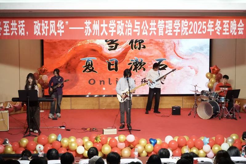 晚会第二篇章“耀今宵,政暖一方”随后展开,丁品文、顾海馨、苏小源等成员组成的Oline乐队以摇滚旋律瞬间引爆现场氛围;项冀的竹笛演奏《姑苏行》笛声悠扬,勾勒出姑苏城的诗意景致;房芮铭、沈睿馨带来合唱《写不完的温柔》,轻柔和声传递细腻情感;耿国辉、曹海媛、赖志坚等表演者带来的小品《诈诈呼呼》,以诙谐剧情和生动表演普及反诈知识;高语嫣、王衍真、严梦琪等演绎的舞蹈《Forever Young》,用灵动舞步诠释青春态度;张泽宇、周雨晨的合唱《霸王别姬》,以磅礴气势演绎经典,将现场氛围推向新高度。