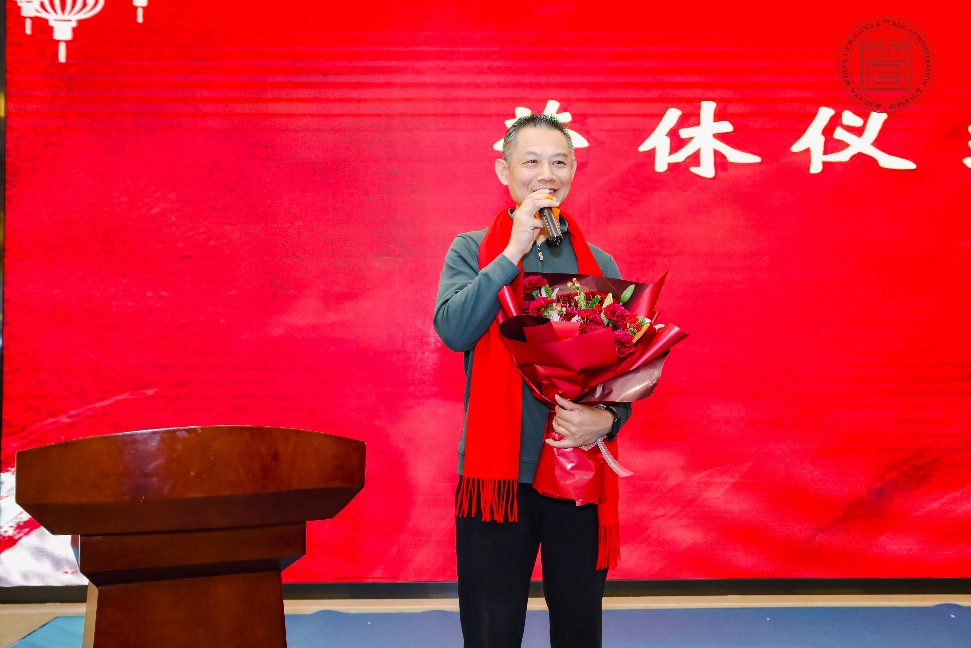 荣休仪式上,学院特别向2025年退休教师代表吉文灿老师献花。吉文灿老师深耕讲台37载,为学院的社会服务与管理工作作出重要贡献。他深情回顾执教岁月,言语中满载对学院的深厚情感和对教育事业的不懈热爱。仪式后,全体参会人员拍摄管院“全家福”,定格温暖瞬间。