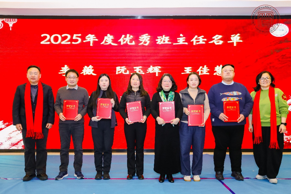 在表彰环节,学院领导为2025年度优秀班主任李薇、阮玉辉、王佳慧、邵健、张晨耕、宋典老师颁发证书,表彰他们潜心育人、关爱学生的奉献精神。学院工会“活力人生,健康加分”运动打卡积分活动获奖教师同时受到表彰。他们以行动诠释了健康生活、积极工作的学院风貌。