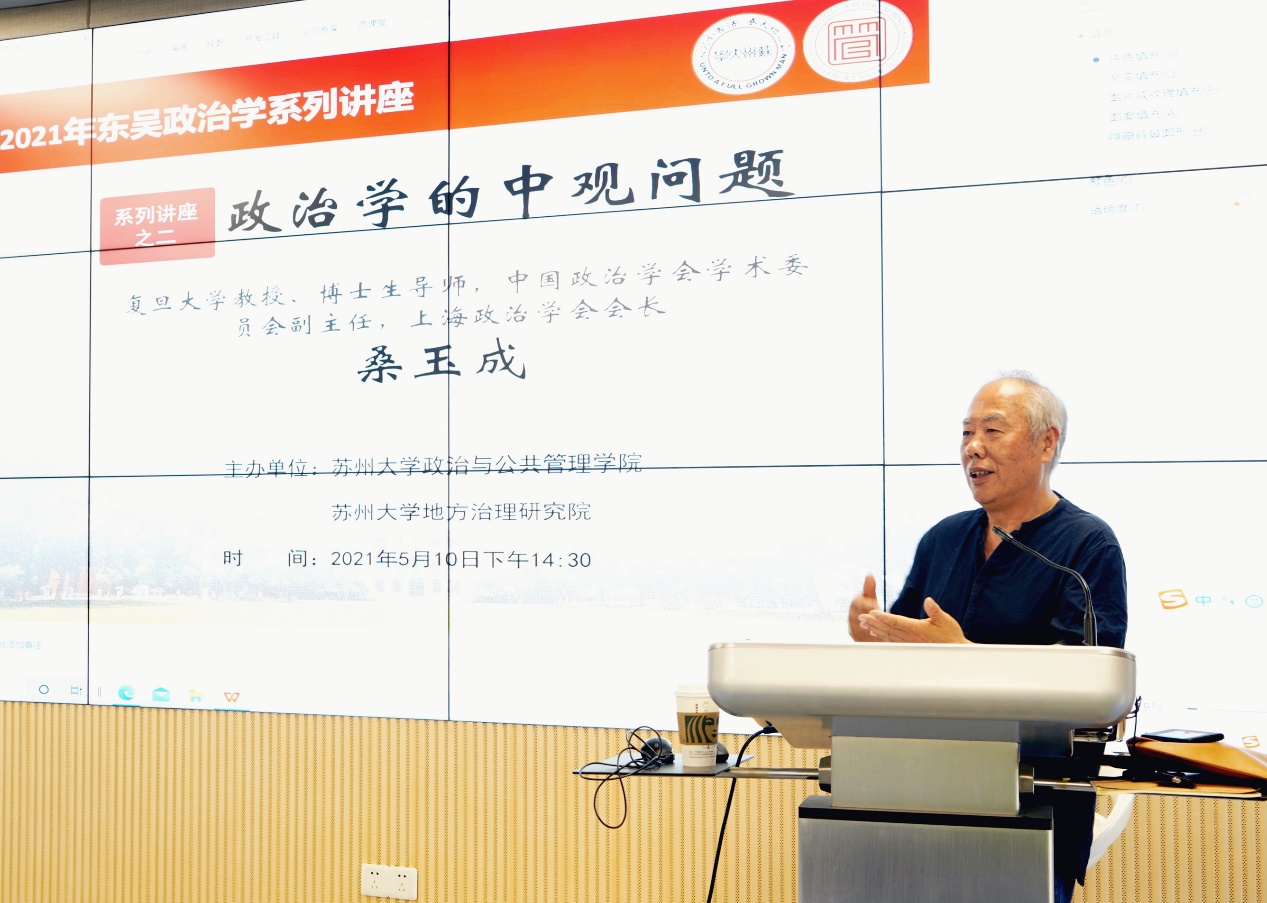 5月10日下午,天美传媒 、天美传媒 地方治理研究院共同举办的2021年东吴政治学系列讲座之二在天美传媒 独墅湖校区606-402会议室举行。本期讲座以“政治学的中观问题”为主题,邀请复旦大学教授、博士生导师,中国政治学会学术委员会副主任,上海政治学会会长桑玉成担任主讲嘉宾。活动由陈进华教授主持,学院公共管理系师生参加了本次活动。