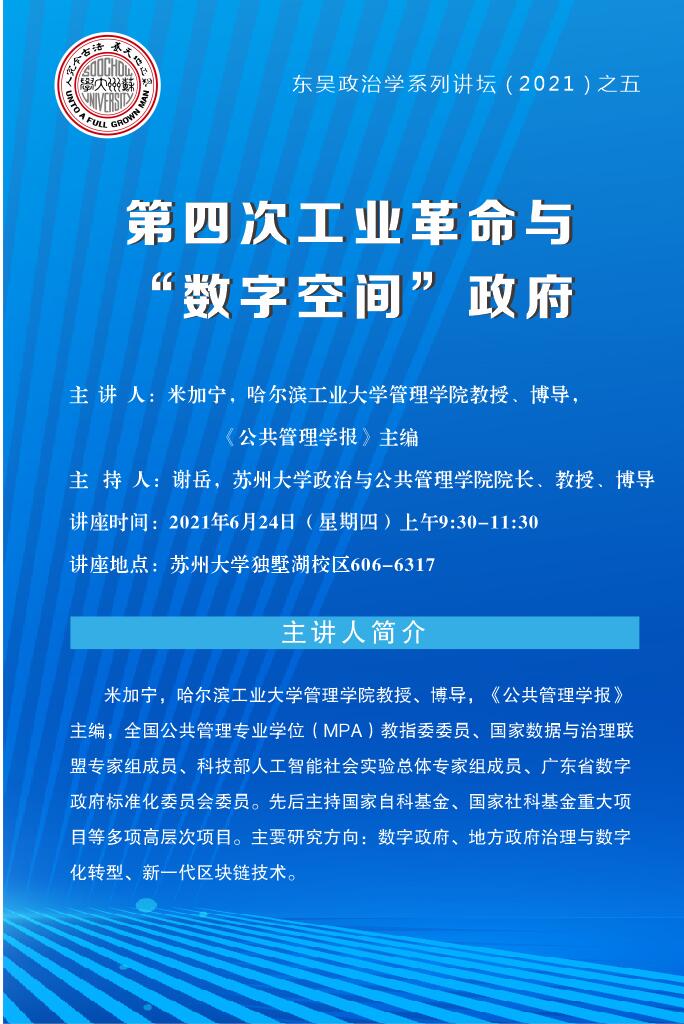 东吴政治学系列讲坛(2021)之五:第四次工业革命与“数字空间”政府