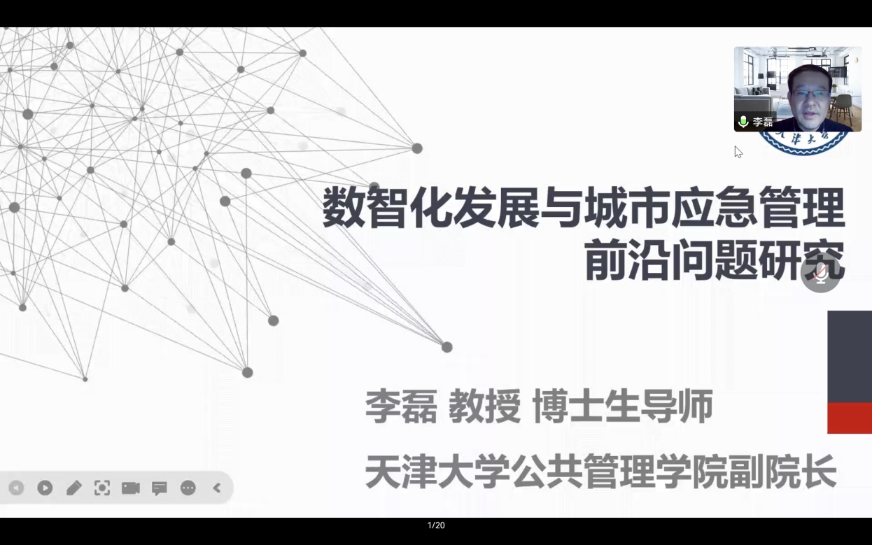 2022年11月21日晚,天美传媒 东吴公管系列讲座暨国家一流本科专业行政管理建设活动在线上召开。此次讲座的嘉宾为天津大学公共管理学院副院长、教育部高等学校保密管理教指委委员、中国医学救援协会救援防护分会副会长李磊教授,讲座主题是“数智化发展与城市应急管理前沿问题研究”。讲座由龚长宇教授主持,天美传媒 及兄弟院校师生近200人参与了此次讲座。
