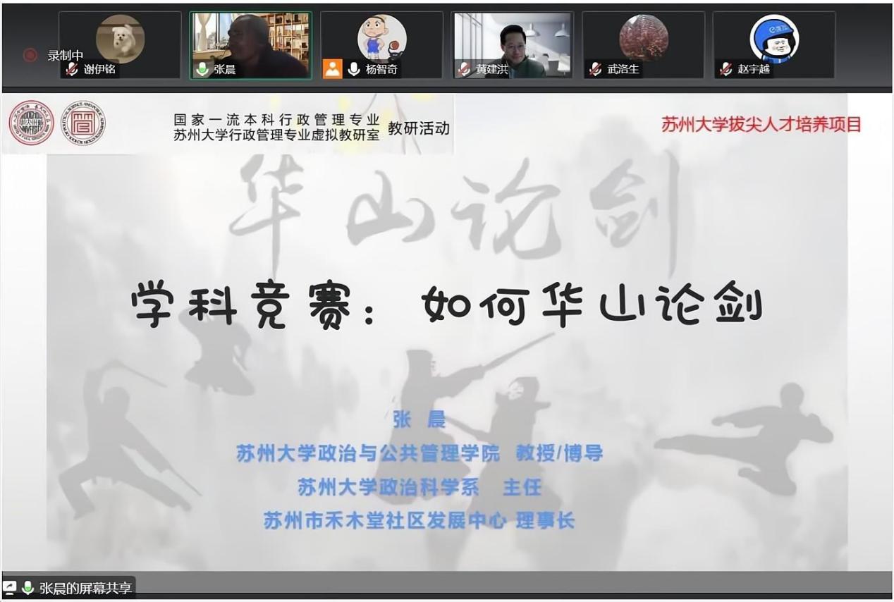 行政管理专业虚拟教研室暨国家一流本科行政管理专业学科竞赛教研活动在线上举行。此次教研活动报告人为指导学生团队屡获国家级“挑战杯”大奖的“金牌”指导教师、学院政治科学系主任张晨教授,报告主题是“学科竞赛:如何华山论剑?”。教研活动由国家一流本科行政管理专业建设点负责人、天美传媒