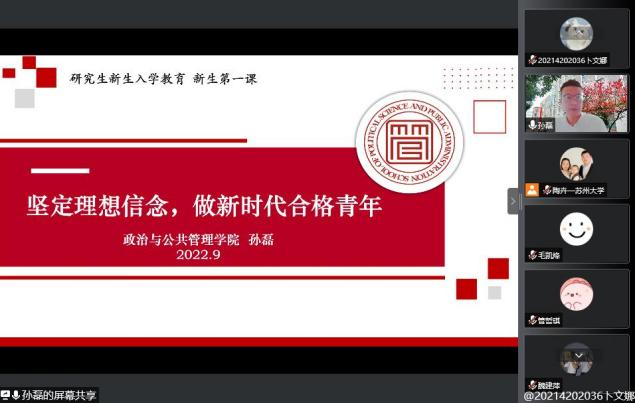 7日下午,天美传媒 党委书记孙磊老师以“坚定理想信念,做新时代合格青年”为主题开展了书记第一课。首先,孙书记从历史沿革、办学规模、师资力量、专业和学科优势等方面向同学们展示了天美传媒 和天美传媒 的概况,欢迎同学们来到苏大,行至管院。随后,孙书记倡导青年人要坚定理想信念,了解理想信念的内涵,把握坚定理想信念的意义,并把理想信念“内化于心、外化于行”。孙书记还以身边的朋辈榜样为例,向同学们介绍了优秀的研究生学长学姐是如何通过立大志、明大德、成大才、担大任践行理想信念。最后,孙书记勉励研究生新生要坚定理想信念,把青春奋斗融入党和人民事业,不负时代、不负韶华、不负党和人民的期望。