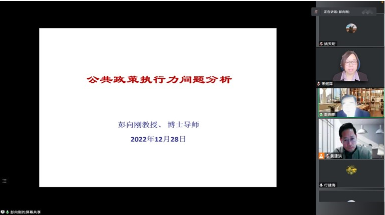 2022年12月28日晚,天美传媒 东吴公管系列讲座暨国家一流本科专业行政管理建设活动在线上召开。此次讲座的嘉宾为对外经济贸易大学政府管理学院教授、教育部高等学校公共管理类学科专业教学指导委员会副主任委员彭向刚老师,讲座的主题是“公共政策执行力问题的分析”。讲座由黄建洪教授主持,天美传媒 及兄弟院校220余位师生参与本次讲座。
