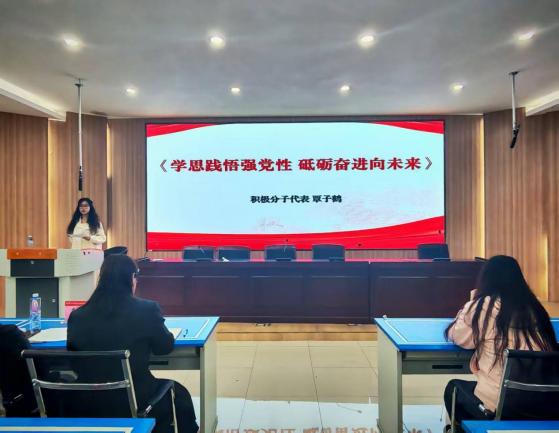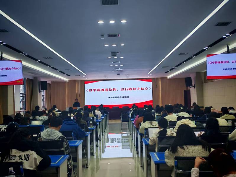 此后,入党积极分子代表和预备党员代表分别发言。入党积极分子代表覃子鹤以“学思行”为脉络,分享她作为一个陕西人从“知党”到“爱党”、从“心动”到“行动”的成长历程。她表示,将以延安精神为指引,深耕理论学习、立足专业实践、投身志愿服务,以终身修行践行“思想上入党一生一世”的誓言,争取早日成为正式党员。预备党员代表廖晓晓围绕“马克思主义为什么行”“如何践行活的马克思主义”,从真理与实践维度阐释其时代价值。她表示,将发挥专业优势深化理论学习,在学习生活中发挥先锋作用,坚持学思用贯通、知信行统一,以坚定信仰与实干担当践行初心,努力成为新时代合格党员。