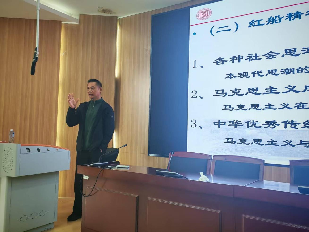 在集体授课环节,吉文灿教授以《“红船精神”及其时代价值》为主题讲授了主题党课。首先,讲解了“红船精神”的来源,即1921年中国共产党第一次全国代表大会在浙江嘉兴南湖红船上的伟大革命实践,由习近平同志于2005年首次正式提出并系统阐释。接着,吉教授结合历史和英烈故事详细阐释了“红船精神”的深刻内涵:开天辟地、敢为人先的首创精神,坚定理想、百折不挠的奋斗精神,立党为公、忠诚为民的奉献精神。最后,吉教授强调了“红船精神”的时代价值:筑牢精神根基,凝聚奋进共识;激发创新动能,助力改革突破;指引为民实践,坚守初心使命。这既是对授课的总结,也是对青年人的鞭策和激励。